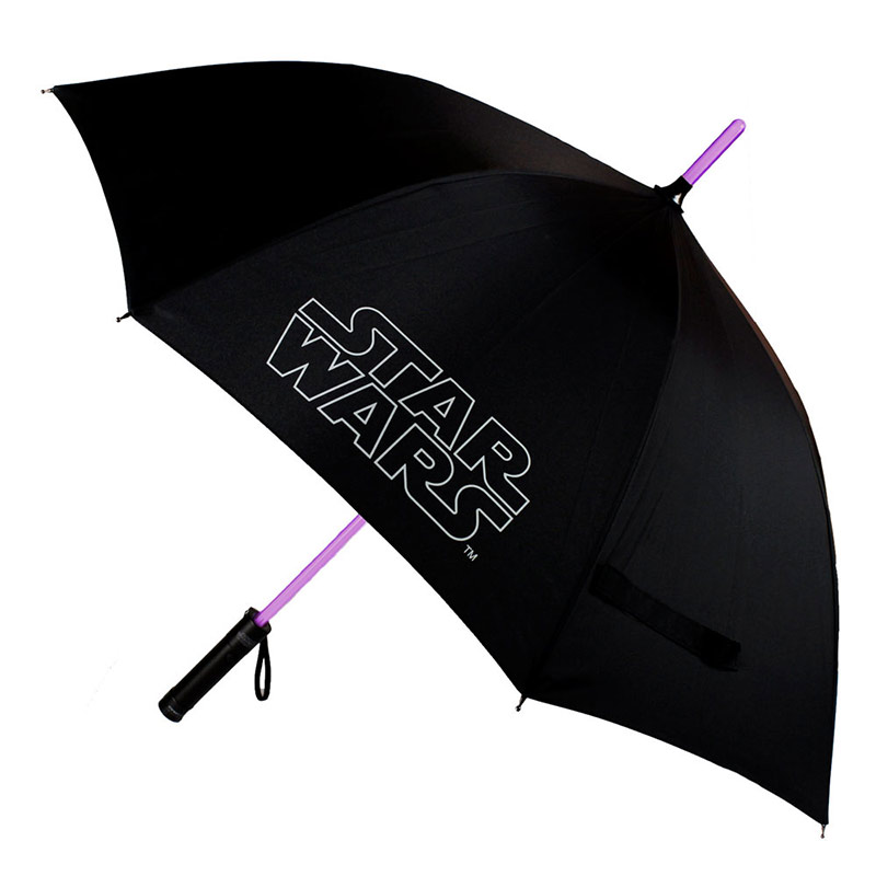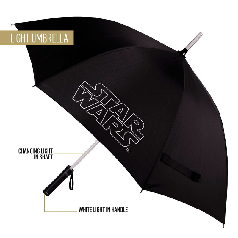 Disfruta cantando bajo la lluvia con este espectacular paraguas con la forma de un sable de luz basado en la saga de Star Wars. Este espectacular paraguas tiene una longitud aproximada de 93 cm., Gracias a sus LED’s tendrás la opción de iluminar el paraguas con el color verde, rojo y azul. En tu mano está ser un malvado Sith o un maestro Jedi. Requiere 3 pilas AAA (no incluidas). Producto oficial Star Wars Light Up Function Umbrella Lightsaber. «El sable de luz de tu padre. El arma de todo caballero Jedi. No es tan abyecta como las armas de fuego. Un arma noble, para tiempos más civilizados.» - Obi-Wan Kenobi