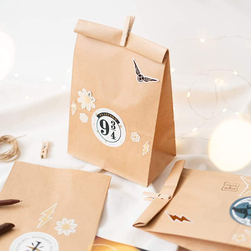 Calendario de adviento personalizable basado en la saga de Harry Potter. Con este calendario de adviento Harry Potter podrás personalizar todas sus bolsitas como más te guste y comenzar la "cuenta atrás" de la manera más mágica posible ¡Puedes meter accesorios Harry Potter en su interior! El set incluye 25 bolsas de papel kraft, 24 pegatinas de números, 2 hojas de pegatinas personalizadas, 25 clips de madera, 6 metros de cuerda de yute, un sello y.. ¡Un bolígrafo en forma de varita! No dejes a los pequeños de la casa sin este creativo calendario adviento niños para que comiencen la navidad de la mano del aprendiz de magía y hechiceria más luchador