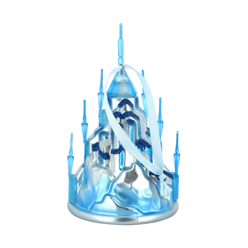 Su diseño reproduce una fortaleza cristalina con torres estilizadas, acabado en azul y plata y un efecto escarchado que capta la luz con un reflejo limpio y elegante. Es una opción muy buscada por quienes quieren comprar un adorno Frozen original con presencia visual real, pensado tanto para árbol como para vitrina o colección temática. El formato colgante con cinta facilita la exposición y permite integrarlo en una decoración navideña cuidada, sin recargar el conjunto.